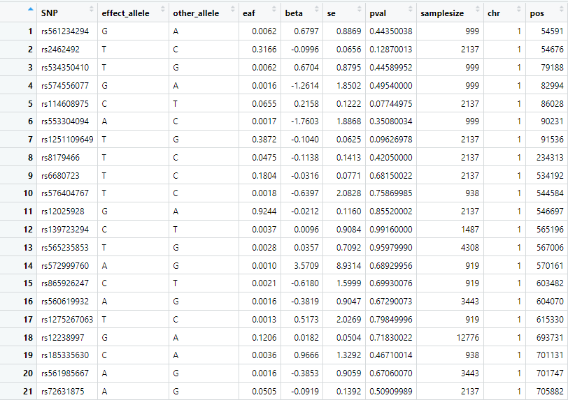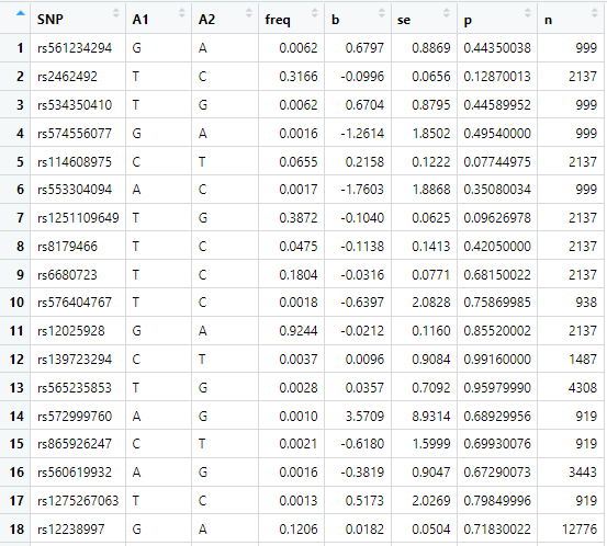 | eaf | 效应等位基因位点的频率, 也就是A1的频率 | 非必须,可以为缺失的列,缺失时记作NA(下同) |